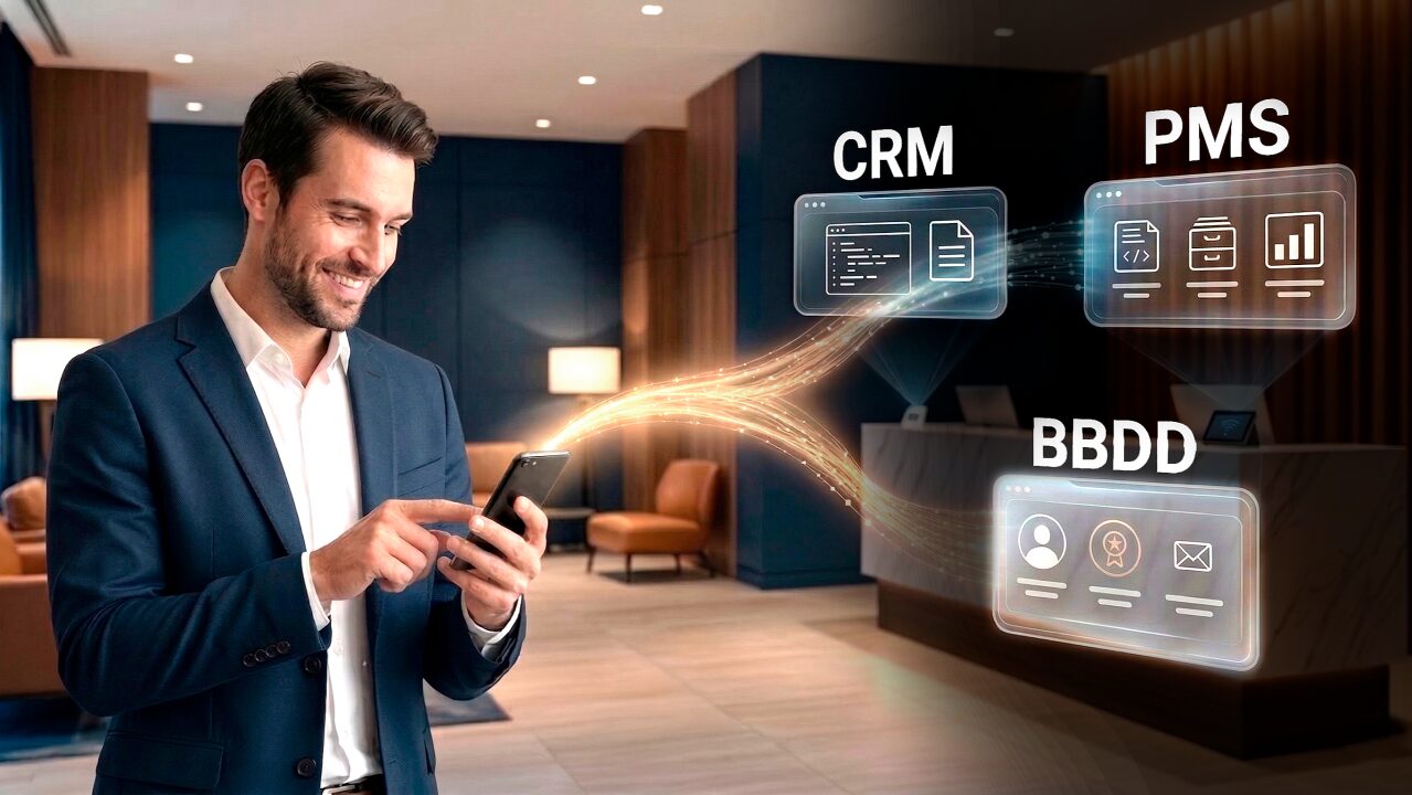 Un escenario muy habitual comienza con la reserva del huésped registrada en el PMS. Al llegar al hotel, el usuario se conecta al WiFi mediante un formulario básico en un portal cautivo genérico, enviando esos datos de conexión a una base de datos independiente. Finalmente, si el establecimiento pone en marcha acciones de marketing, esa información termina en el CRM, pudiendo llegar a tener dos, incluso tres bases de datos no conectadas entre sí.